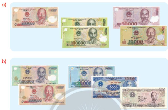 b) Hình b có số tiền là 500 000 + 200 000 + 20 000 + 5 000 + 2 000 = 727 000 (đồng)