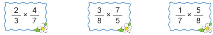 b) Ghép thẻ ghi phép nhân phân số với thẻ hình và thẻ ghi kết quả thích hợp theo quy tắc: Muốn nhân hai phân số, ta lấy tử số nhân với tử số, mẫu số nhân với mẫu số.