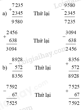 b) Thực hiện phép trừ rồi thử lại bằng phép cộng:
