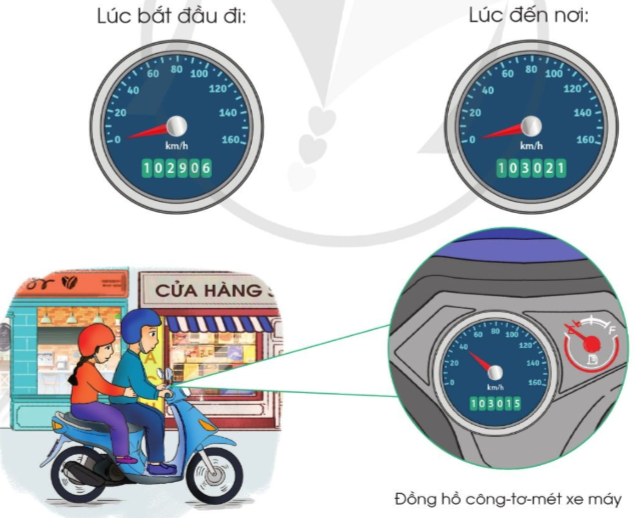 Quãng đường mà xe máy đó đã đi được = Số trên đồng hồ công-tơ-mét lúc đến nơi - Số trên đồng hồ công-tơ-mét lúc bắt đầu đi