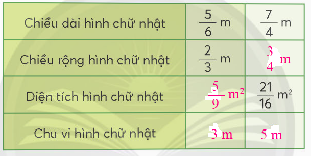 Chu vi hình chữ nhật là: $\left( {\frac{5}{6} + \frac{2}{3}} \right) \times 2 = 3$ (m)