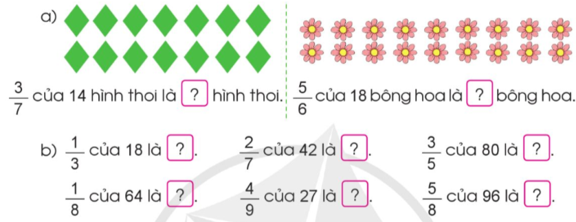 a) $\frac{3}{7}$ của 14 hình thoi là: $14 \times \frac{3}{7} = 6$ (hình thoi)