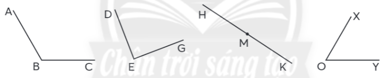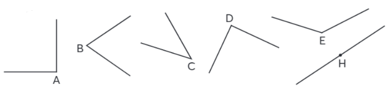 Trong các góc dưới đây, góc nào là: góc nhọn, góc vuông, góc tù, góc bẹt?