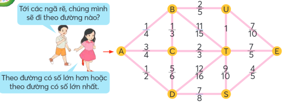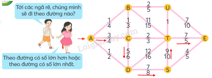 Tại mỗi ngã rẽ em so sánh các phân số rồi đi theo đường có số lớn hơn hoặc theo đường có số lớn nhất.