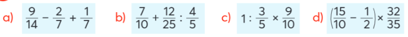 d) $\left( {\frac{{15}}{{10}} - \frac{1}{2}} \right) \times \frac{{32}}{{35}} = \left( {\frac{3}{2} - \frac{1}{2}} \right) \times \frac{{32}}{{35}} = 1 \times \frac{{32}}{{35}} = \frac{{32}}{{35}}$