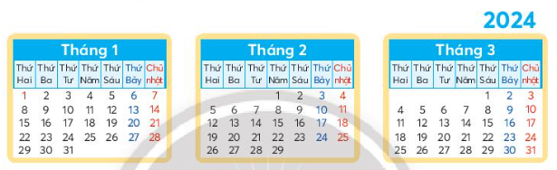 Xem ba tờ lịch của năm 2024 và trả lời câu hỏi.