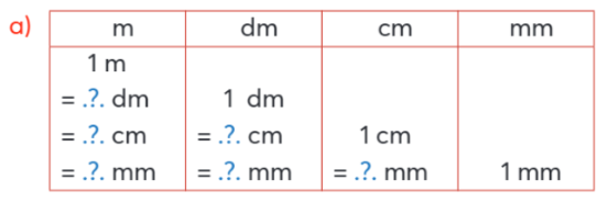 $\frac{1}{{10}}$ m = ....... dm , $\frac{1}{{10}}$ cm = ........ mm