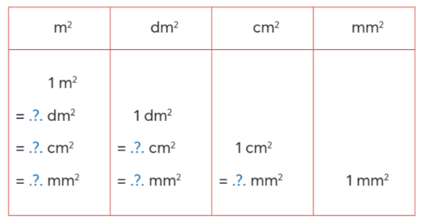 $\frac{1}{{100}}$m2 = 1 dm2 ; $\frac{1}{{100}}$cm2 = 1 mm2