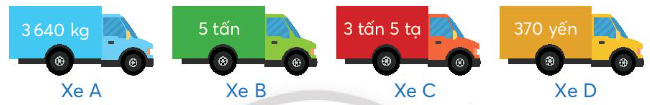 Vậy các xe theo thứ tự hàng hóa vận chuyển từ nặng đến nhẹ là: Xe B, xe D, xe A, xe C