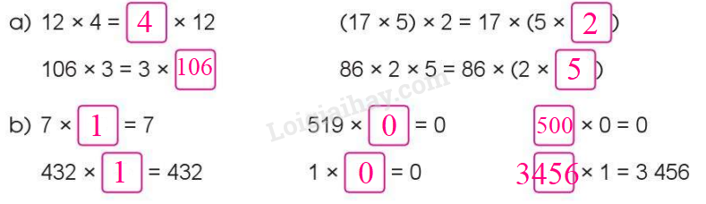 - Tính chất giao hoán: Khi thực hiện phép nhân hai số, ta có thể đổi chỗ các thừa chỗ mà tích không thay đổi.
