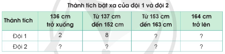 Dựa vào kết quả bật xa của đội 1 và đội 2 để hoàn thành thông tin trong bảng.