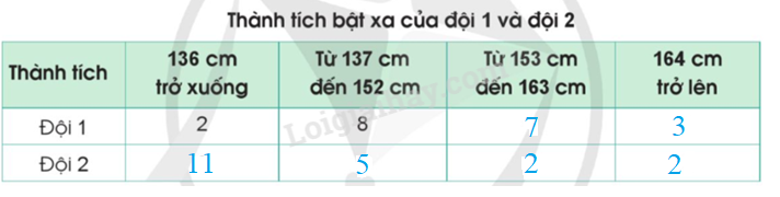 - Đội 1 có số thành viên có kết quả bật xa từ 137 cm đến 152 cm nhiều hơn đội 2