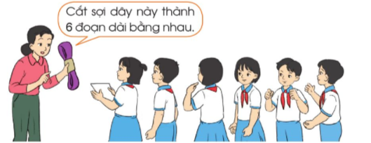 Cô giáo cắt một sợi dây lụa thành 6 đoạn dây dài bằng nhau để đưa cho 6 bạn tham gia tiết mục múa của lớp. Hỏi mỗi đoạn dây đó chiếm mấy phần sợi dây?