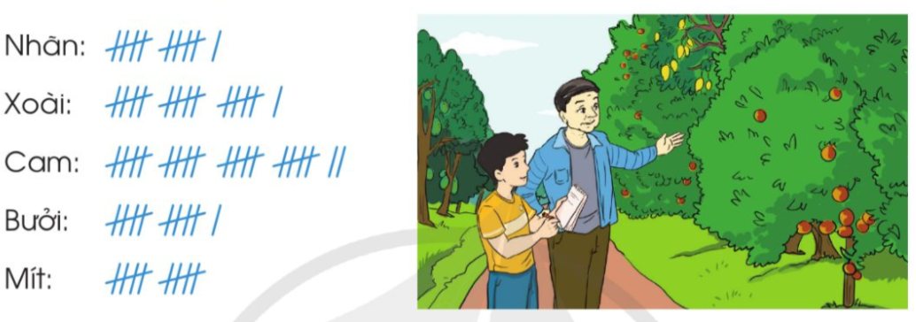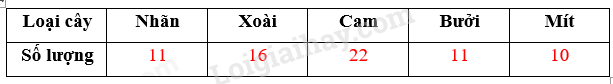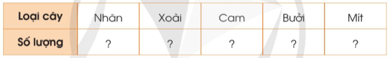 Khi đi thăm vườn cây ăn quả nhà ông, Nguyên đã kiểm đếm một số loại cây ăn quả và ghi lại kết quả như sau: