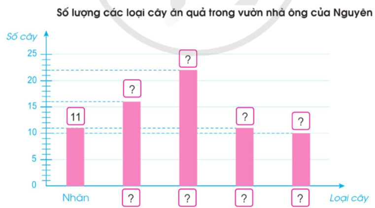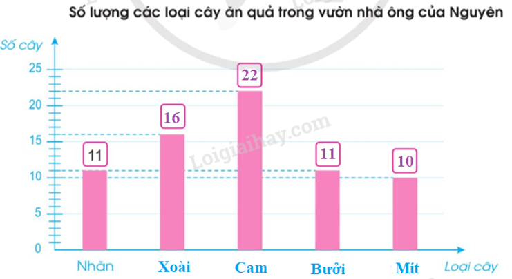 - Trong các loại cây Nguyên kiểm đếm, loại cây có số lượng nhiều nhất là cam, loại cây có số lượng ít nhất là mít, loài cây có số lượng bằng nhau là nhãn và bưởi.