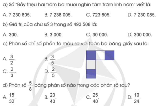 b) Chữ số 3 trong số 493 508 thuộc hàng nghìn nên có giá trị là 3 000. Chọn B
