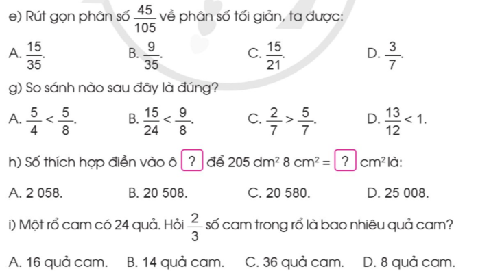 e) Ta có $\frac{{45}}{{105}} = \frac{{45:15}}{{105:15}} = \frac{3}{7}$. Chọn D