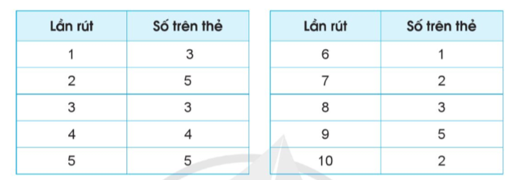 Hãy kiểm đếm số lần xuất hiện thẻ số 3 và thẻ số 5 sau 10 lần rút ngẫu nhiên.