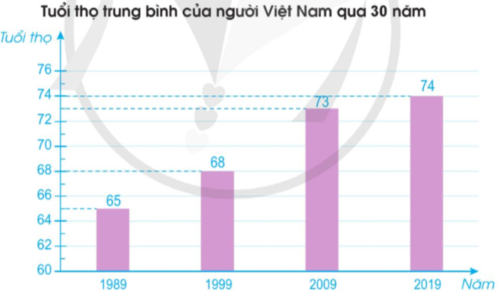 c) Từ năm 1989 đến năm 2019, tuổi thọ trung bình của người Việt Nam đã tăng lên là: 74 - 65 = 9 (tuổi)