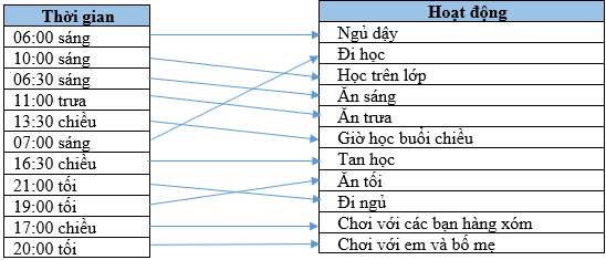 a) Em hãy ghép thời gian và hoạt động phù hợp để tạo thành thời gian biểu hợp lí cho một ngày của bạn Lan: