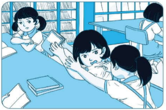 Các bạn đang đọc sách ở thư viện. Hai bạn nữ ngồi gần nhau đang tranh giành quyển sách gây mất trật tự, ảnh hưởng đến các bạn đọc xung quanh. Hai bạn đã không tuân thủ đúng theo quy định của thư viện. Chúng ta không đồng tình với việc làm trên.