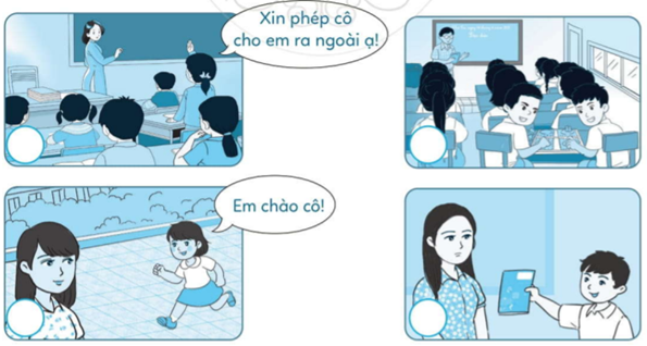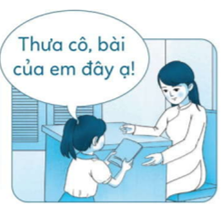 Chào hỏi thầy giáo. Đưa vở cho cô bằng hai tay