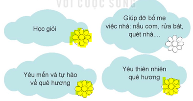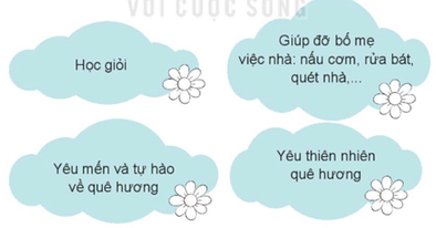 Em cần làm gì để thể hiện tình yêu quê hương? Tô màu vào ở những suy nghĩ em cho là đúng.