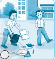 Bé trai không giúp đỡ bạn nhặt sách vở, đồ dùng bị rơi mà đức đút tay túi quần đi qua với thái độ thờ ơ, vô cảm.