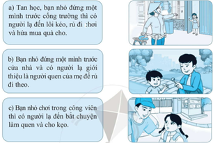 - Trong tình huống này, em đang ở một mình. Việc nghe lời, đi theo người lạ tiềm ẩn rủi ro nếu người lạ đó là người xấu, người ấy có thể làm hại em mà không ai biết.