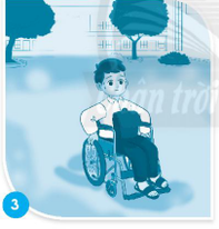 Đôi chân bạn nhỏ bị thương. Bạn nhỏ phải ngồi xe lăn đi học