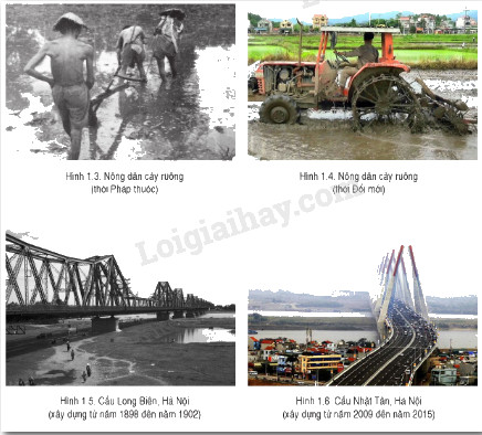 - Quan sát các hình từ 1.3 đến 1.6, ta thấy kĩ thuật canh tác nông nghiệp của người nông dân Việt Nam và hệ thống giao thông ở Hà Nội có sự thay đổi rõ rệt.