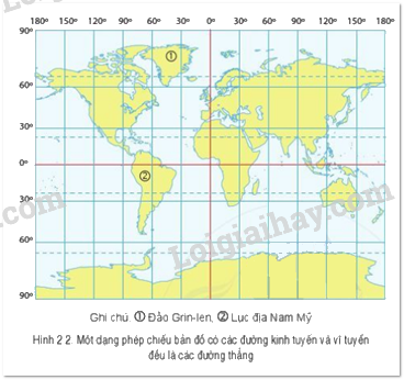 - Hình 2.2: Phép chiếu bản đồ có các đường kinh tuyến và vĩ tuyến đều là các đường thẳng thì diện tích đảo Grin-len nhỏ hơn không đáng kể so với lục địa Nam Mỹ.