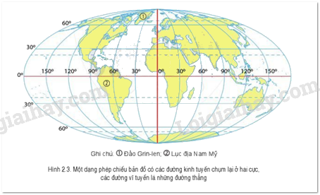 - Hình 2.3: Phép chiếu bản đồ có các đường kinh tuyến là những đường cong chụm lại ở hai cực, các đường vĩ tuyến là những đường thẳng song song với nhau thì ta thấy diện tích đảo Grin-len nhỏ hơn rất nhiều so với lục địa Nam Mỹ.