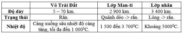 Hãy nêu sự khác nhau về độ dày, trạng thái, nhiệt độ giữa vỏ Trái Đất, man-ti và nhân (có thể lập bảng so sánh).