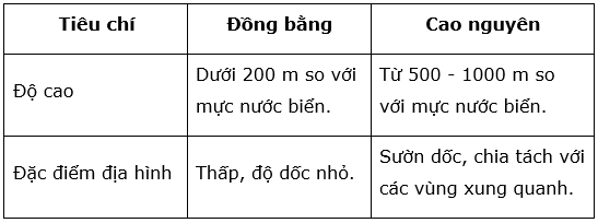 - Cao nguyên là vùng rộng lớn, địa hình tương đối bằng phẳng hoặc lượn sóng, độ cao từ 500 m đến 1000 m so với mực nước biển.