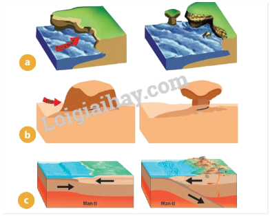+ Hình b: Do gió thổi vào các mỏm núi, thời gian dài khiến sườn núi dần dần bị ăn mòn, biến mất.