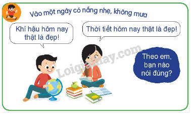- Giải thích: "Vào một ngày có nắng nhẹ, không mưa" - là trạng thái của khí quyển diễn ra trong khoảng 1 ngày và có thể thay đổi vào hôm sau => Thời tiết.