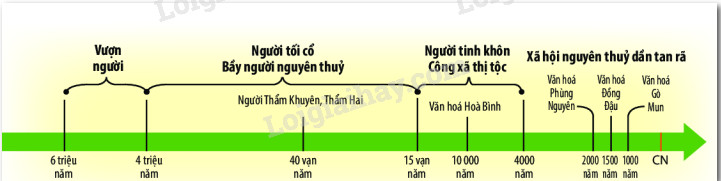 Dựa vào hình trên và trục thời gian (tr.16), em hãy cho biết quá trình tiến hóa từ vượn thành người đã trải qua các giai đoạn nào? Cho biết niên đại tương ứng của các giai đoạn đó?