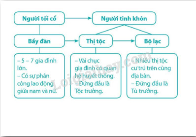 + Giai đoạn thứ hai là giai đoạn của Người tinh khôn, xã hội được chia thành thị tộc, bộ lạc. Thị tộc gồm vài chục gia đình có quan hệ huyết thống mà đứng đầu là tộc trưởng. Bộ lạc gồm nhiều thị tộc cư trú trên cùng bản địa, người đứng đầu là tù trưởng.