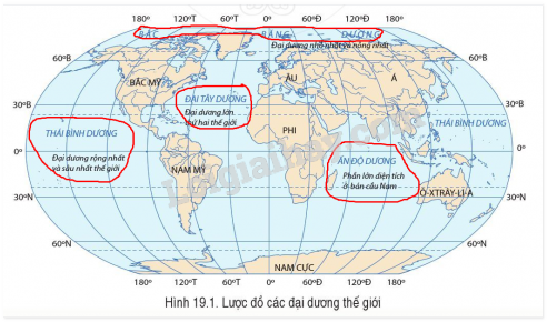 Hãy xác định bốn đại dương chính trong hình 19.1. Dựa vào bảng 19.1, hãy cho biết đại dương nào có diện tích lớn nhất. Đại dương nào có diện tích nhỏ nhất?