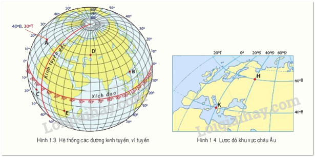 Hãy viết tọa độ địa lí của điểm B, C trong hình 1.3 và điểm H, K trong hình 1.4.