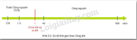 Quan sát sơ đồ hình 2.3, hãy giải thích khái niệm trước Công nguyên và Công nguyên.