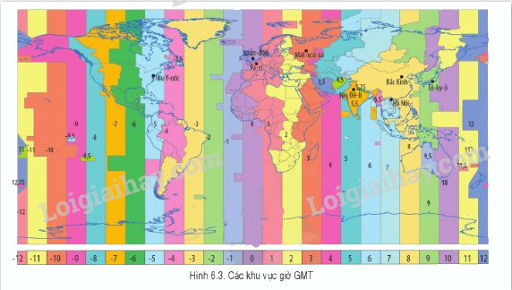 2. Quan sát hình 6.3 và 6.4 kết hợp với kiến thức trong SGK phần Giờ trên Trái Đất.