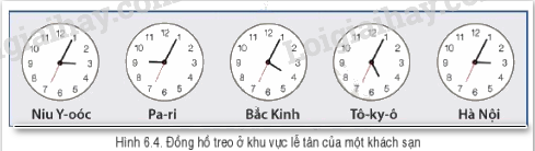 Quan sát hình 6.4, hãy giải thích tại sao mỗi đồng hồ ở khách sạn lại chỉ một giờ khác nhau.