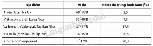 Bảng 13.1. Vĩ độ và nhiệt độ trung bình năm của một số địa điểm trên thế giới