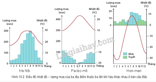 Dựa vào các biểu đồ nhiệt độ - lượng mưa ở các địa điểm Hà Nội (Việt Nam), Pa-lec-mô (I-ta-li-a), Hon-man (Ca-na-đa) đưới đây, hãy:
