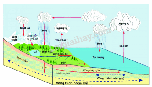 - Nước mưa và băng tuyết tan một phần tạo ra các dòng chảy trên mặt, một phần thấm xuống nước. Sau đó, đổ ra biển, kết thúc vòng tuần hoàn lớn của nước.