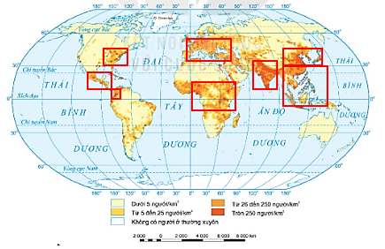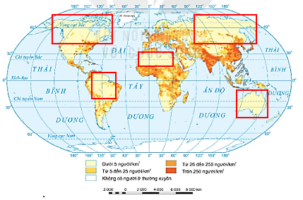 - Xác định các khu vực trên thế giới có mật độ dân số trên 250 người/km2 và các khu vực có mật độ dân số dưới 5 người/km2.