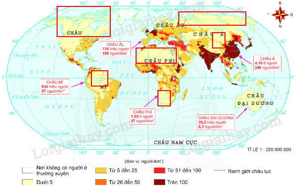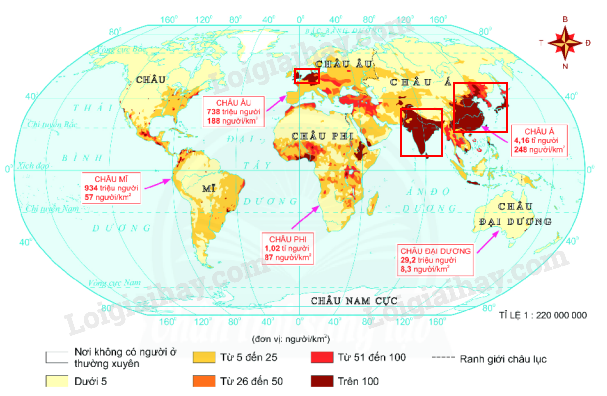 - Những khu vực đông dân (mật độ dân số trên 100 người/km2): phía đông và phía nam châu Á, một phần nhỏ Tây Âu,...