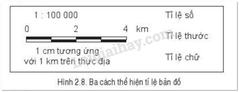 Quan sát hình 2.8, hãy cho biết có bao nhiêu cách thể hiện tỉ lệ bản đồ. Đó là những cách nào?